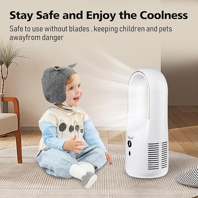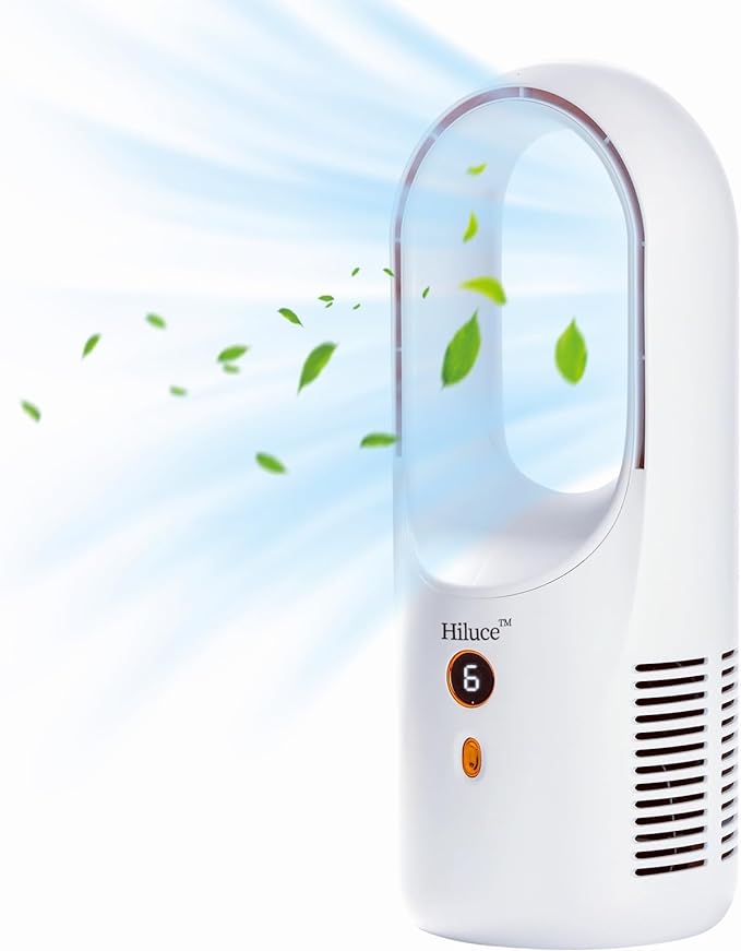 - The Hiluce table fan features a bladeless design, generating airflow through an internal motor and a specially designed air circulation system.